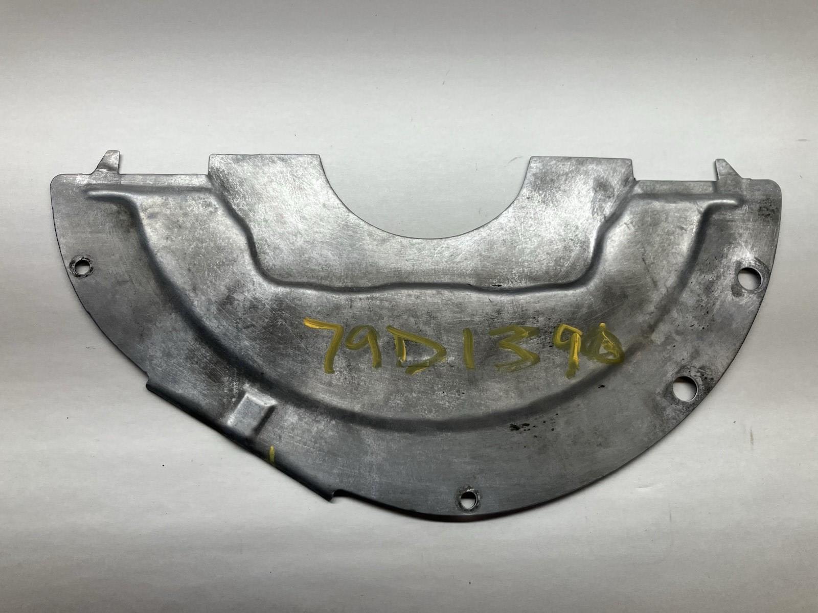 This is a used dust shield removed from a 1979 Dodge D100 with a 3.7 Slant Six engine and 727 automatic transmission. It is in good condition, not cracked or worn.