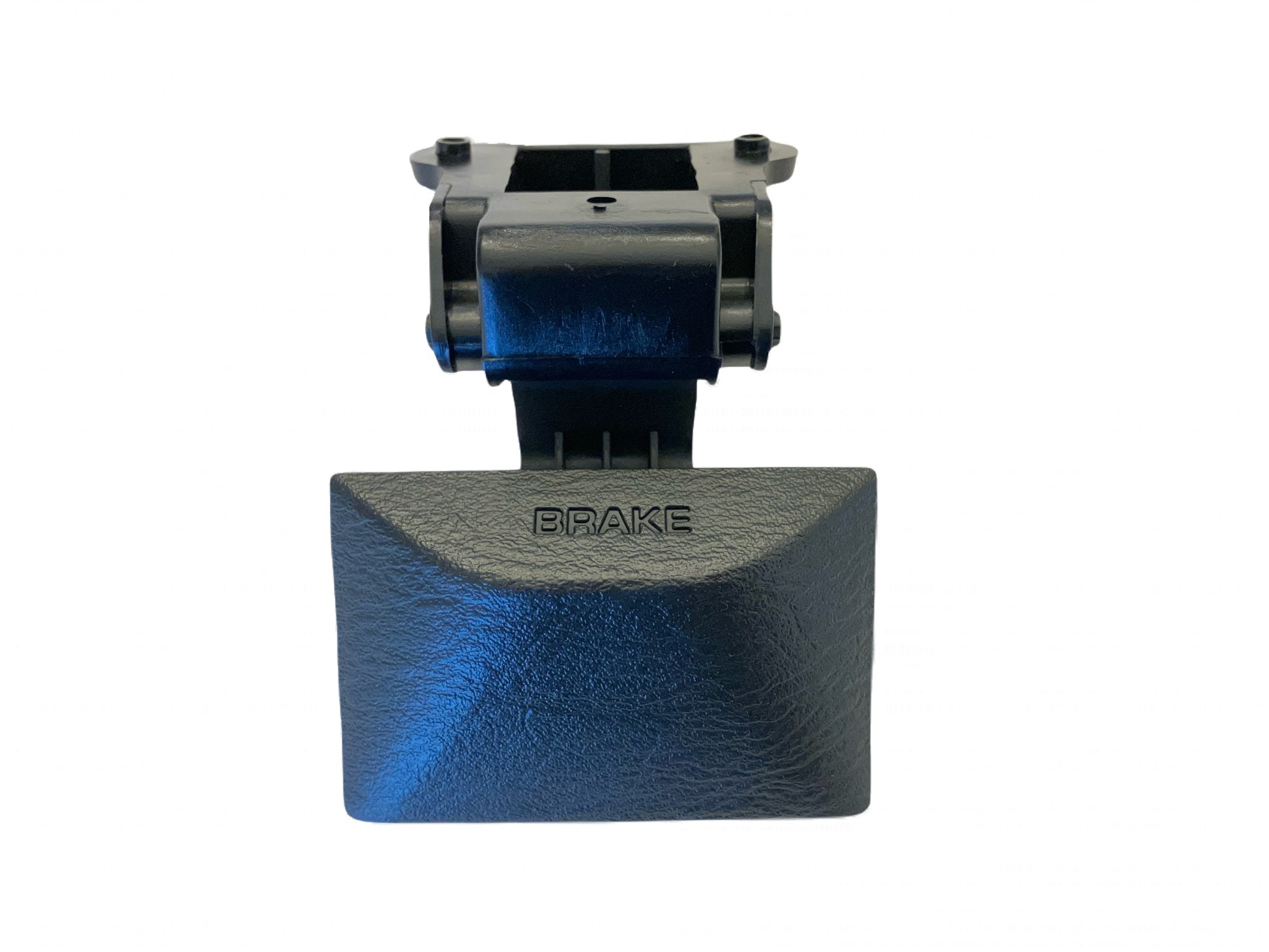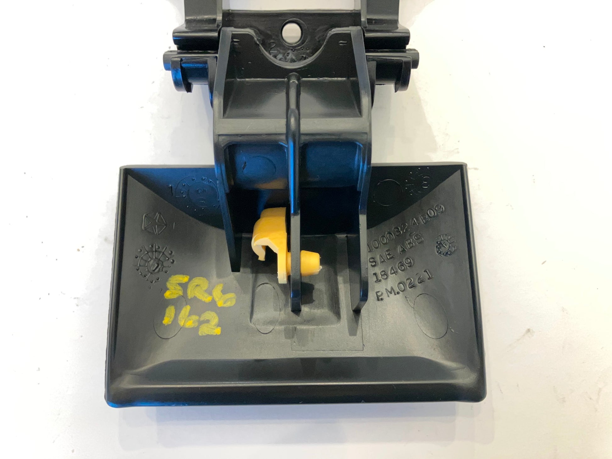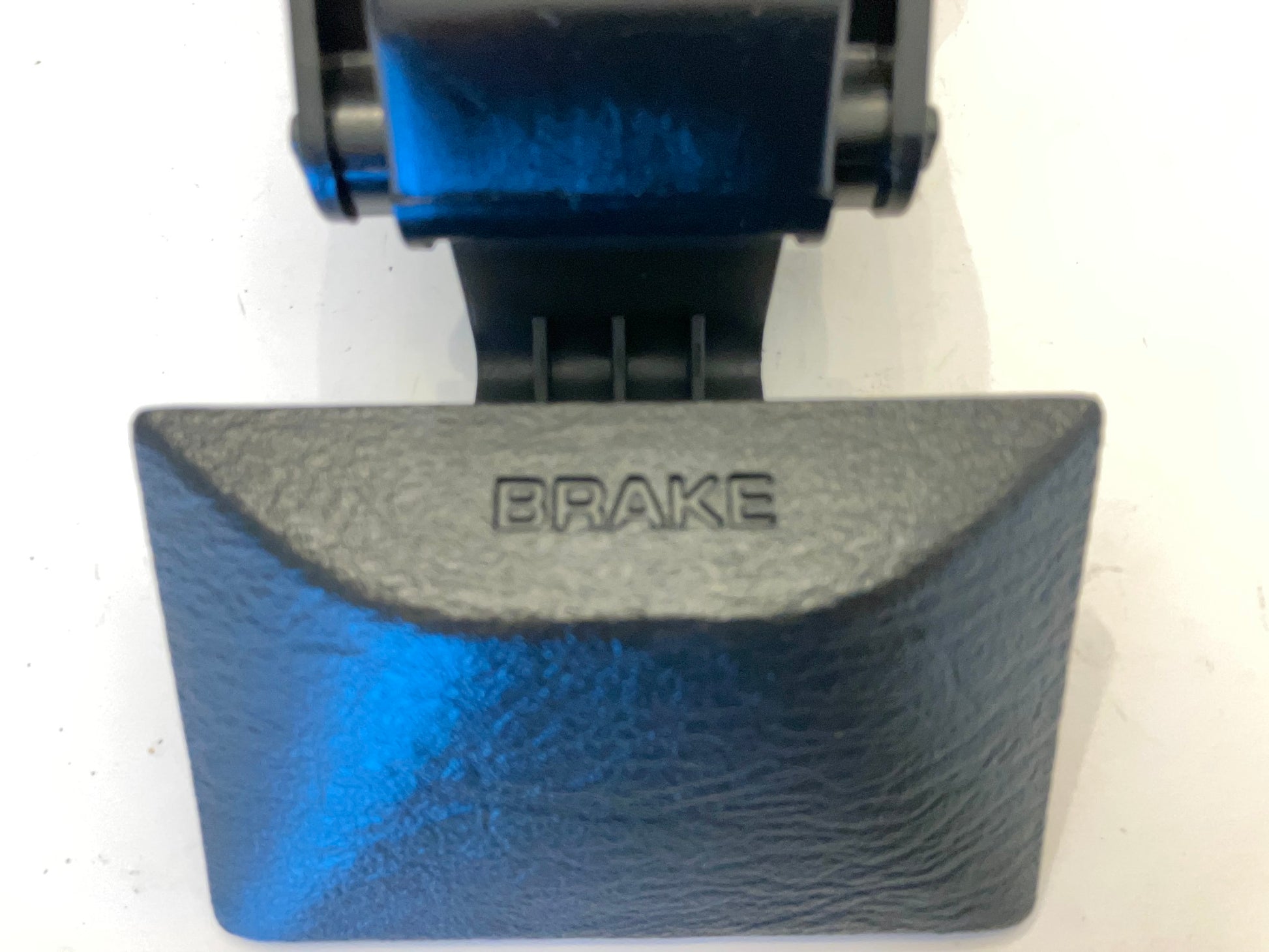 This is a used emergency brake release handle, black (dark slate gray) in color, removed from a 2005 Ram 1500. The Mopar part number is WL851DVAA. It will show only minor scuffing and dust.