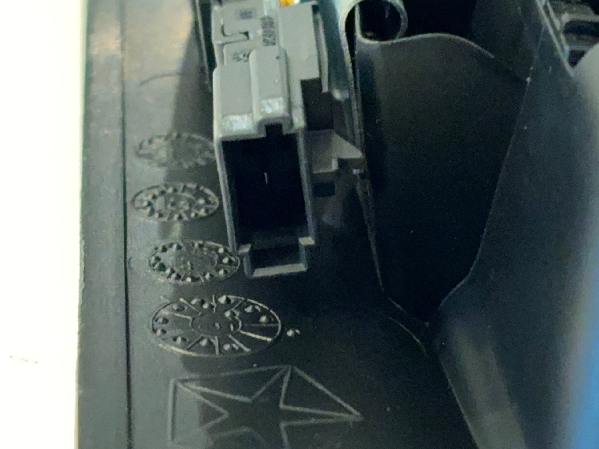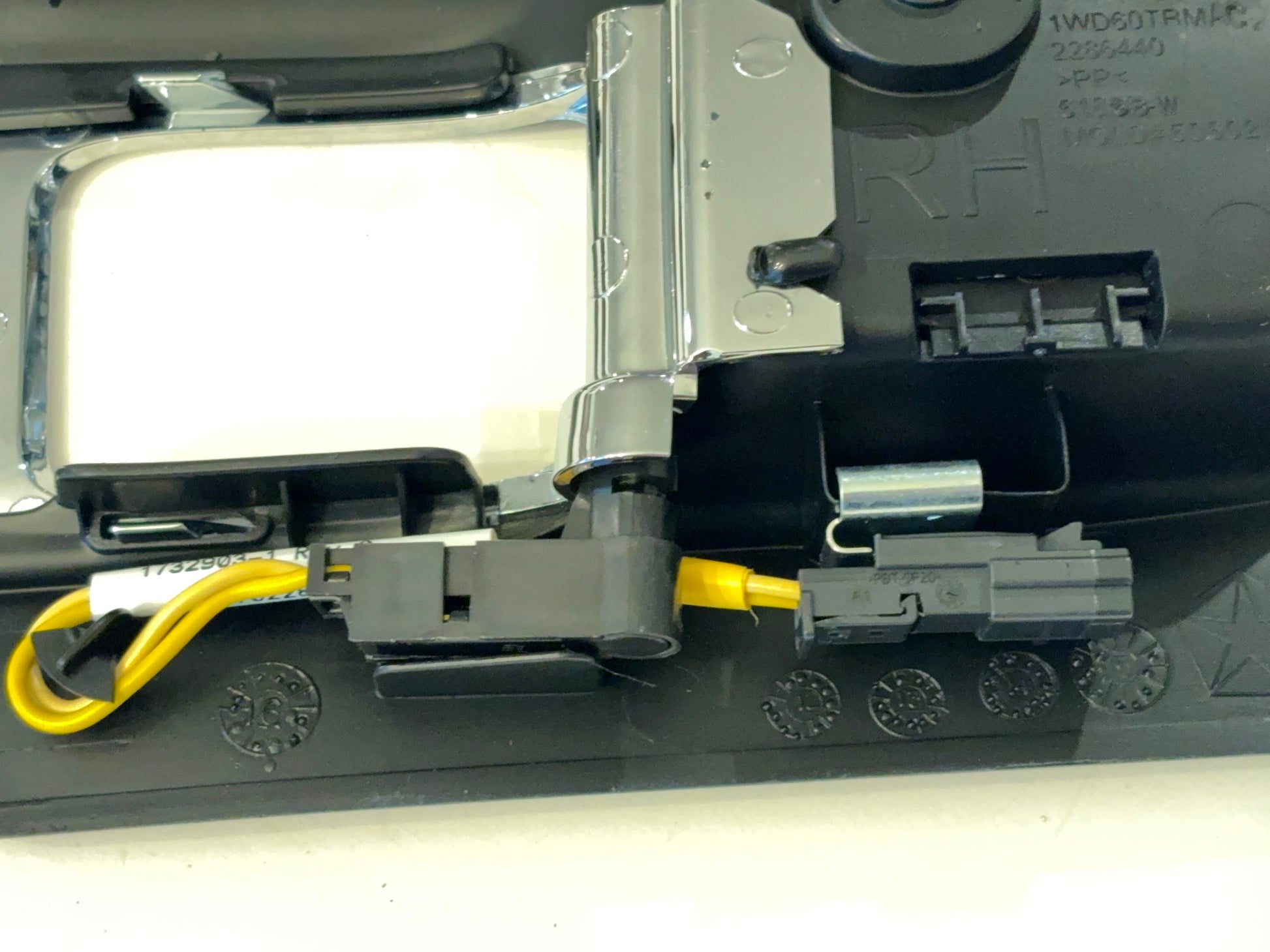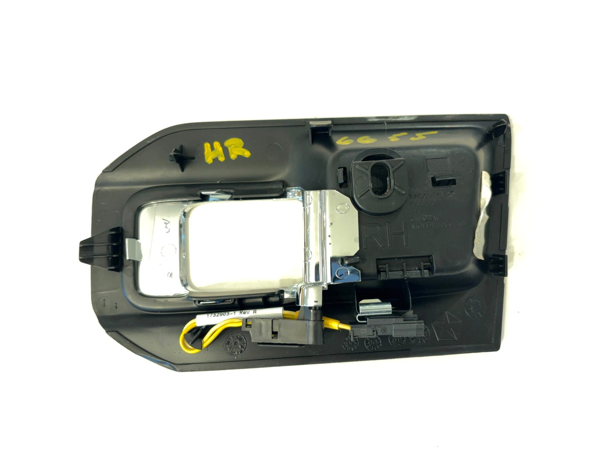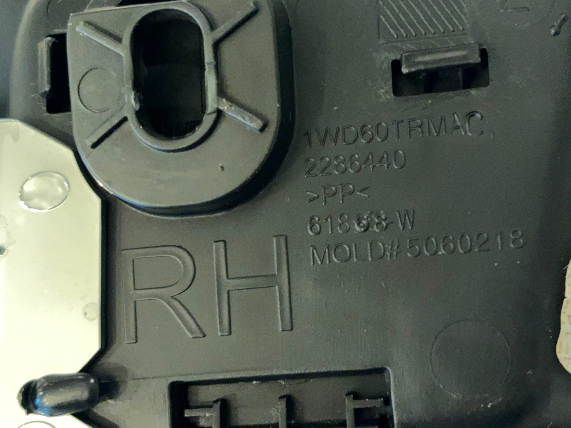 This is a used passenger side door handle trim bezel removed from a 2017 Ram 1500 Laramie. This will fit either the passenger front or passenger rear door. The Mopar part number is 1WD60DX9AC. It was removed from a truck with the black interior, trim code X9. It is in good used condition; it has some nicks from removal and some scuffing. The LED light and wiring are included.