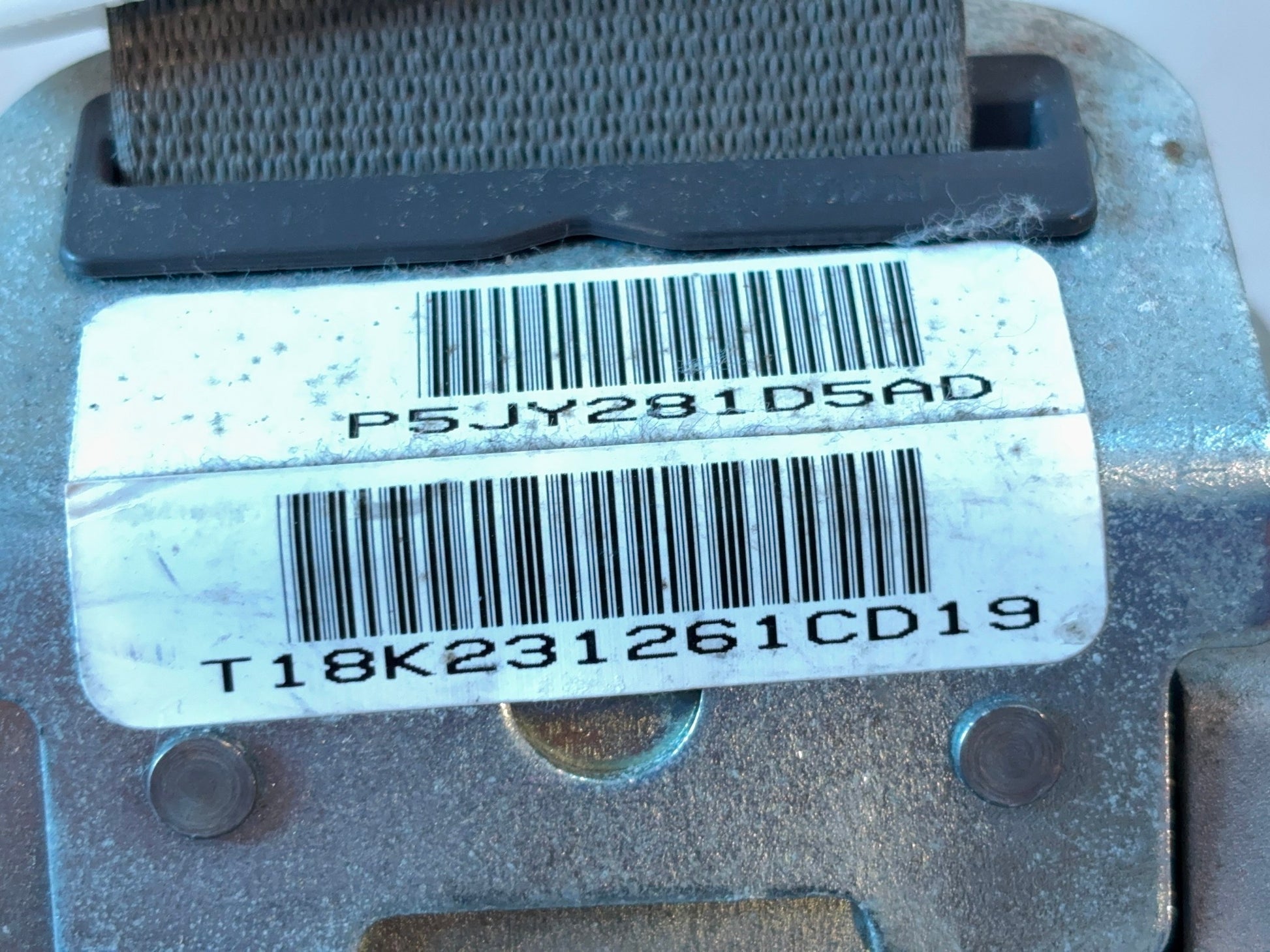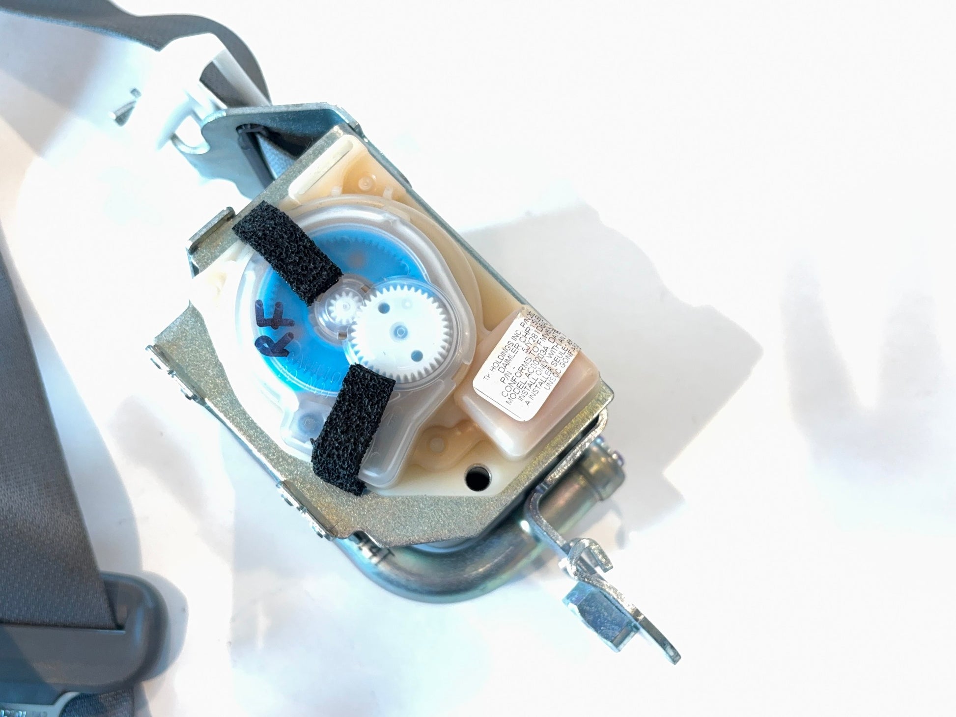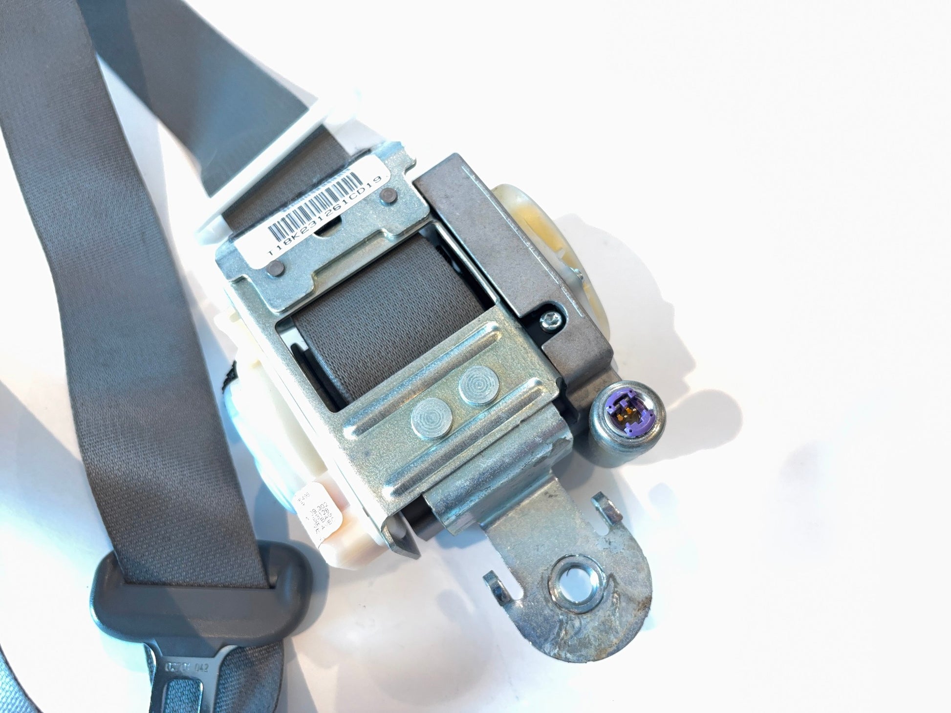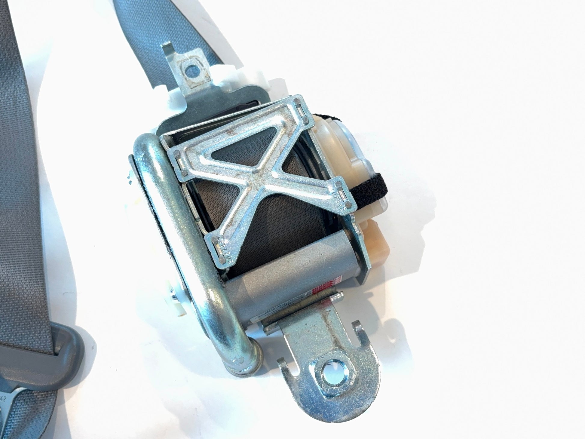 This is a passenger (right-hand) front seat belt retractor removed from a 2006 Ram 2500 Quad Cab with the medium slate interior. The Mopar part number is 5JY281D5AB. This is in fair used condition. The plastic trim is smudged and the belt is dirty. Please check all pictures carefully for the best view of the item's condition.