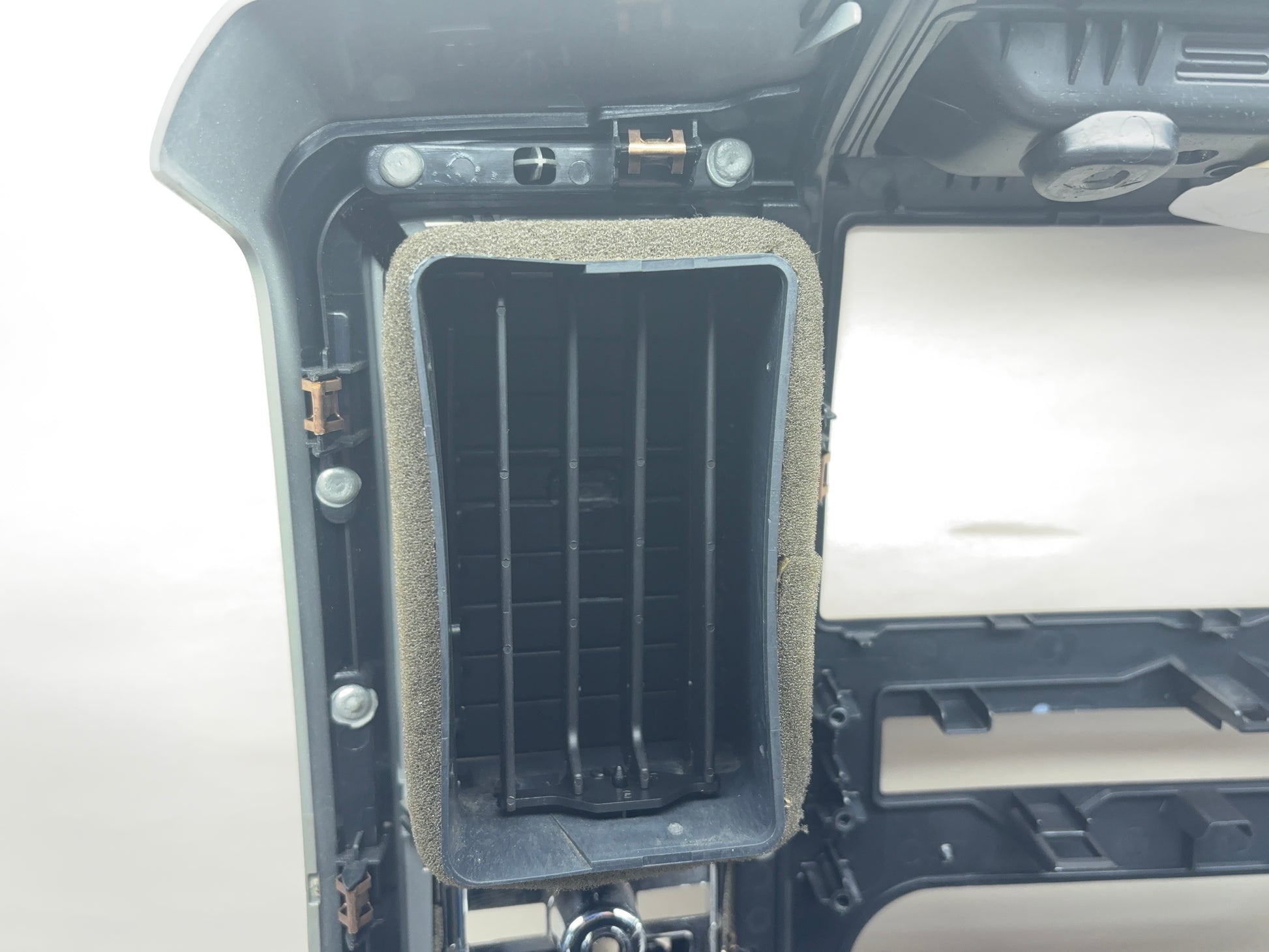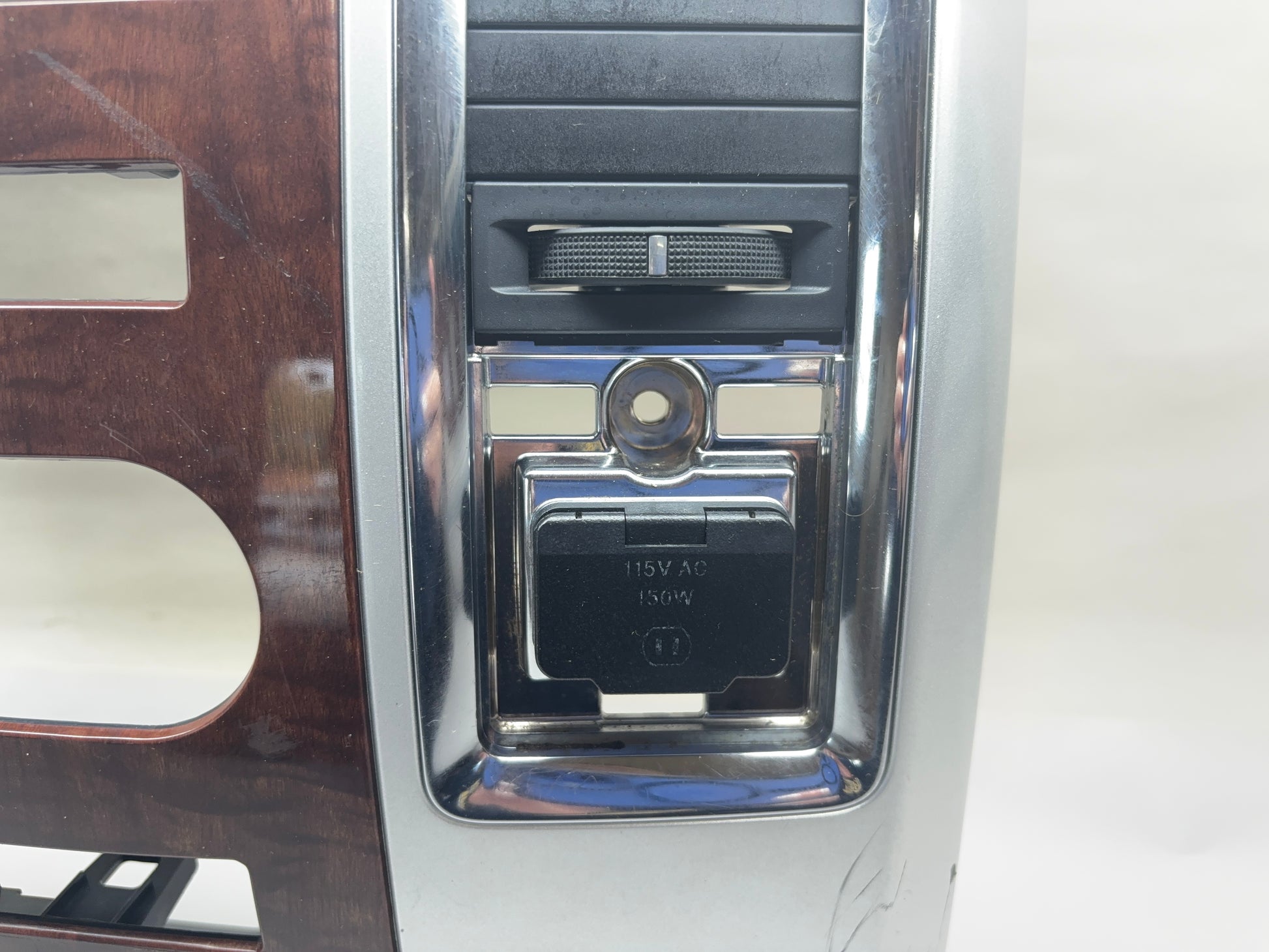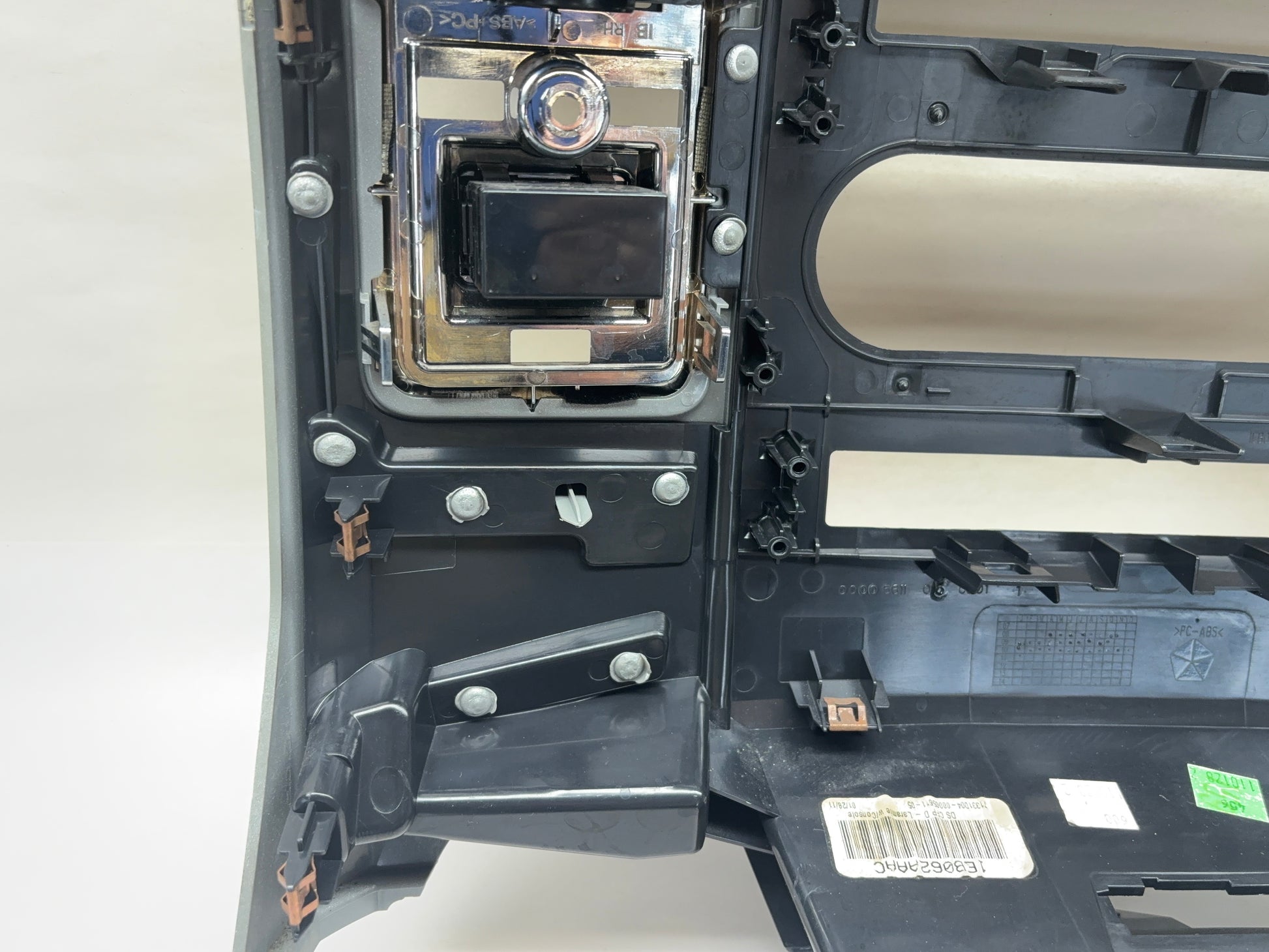 This is a used radio bezel removed from a 2011 Ram 1500 Laramie. This bezel is in fair used condition, the driver side vent has one slat that is broken and the inverter plug bezel is missing. There is some marking on the lower passenger side and some light scuffs and scratches on the exterior. All mounting tabs are intact. The Mopar part number is 1EB062AAAB.