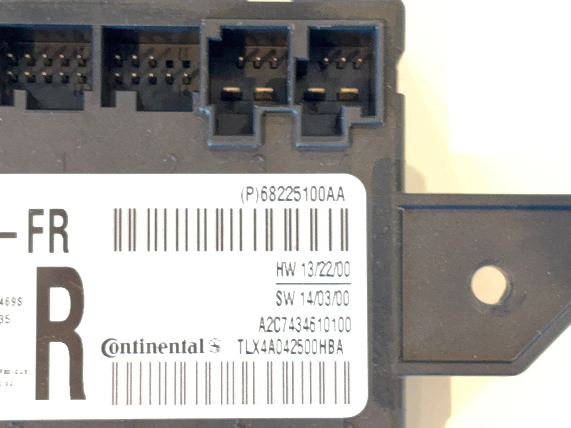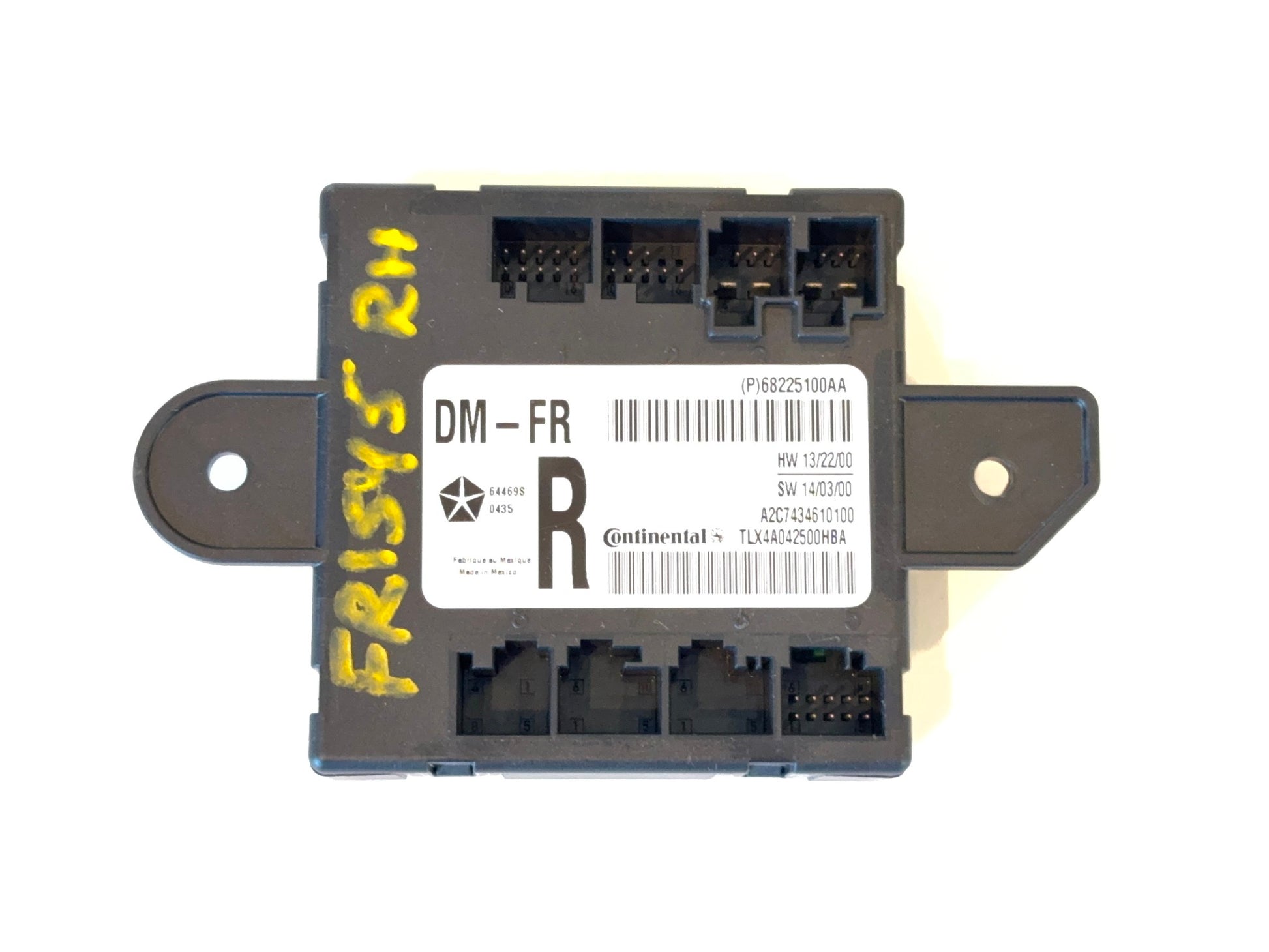 This is a used passenger side (right-hand) door module removed from a 2015 Ram 1500. The Mopar part# is 68225100AA. It is in good used condition.