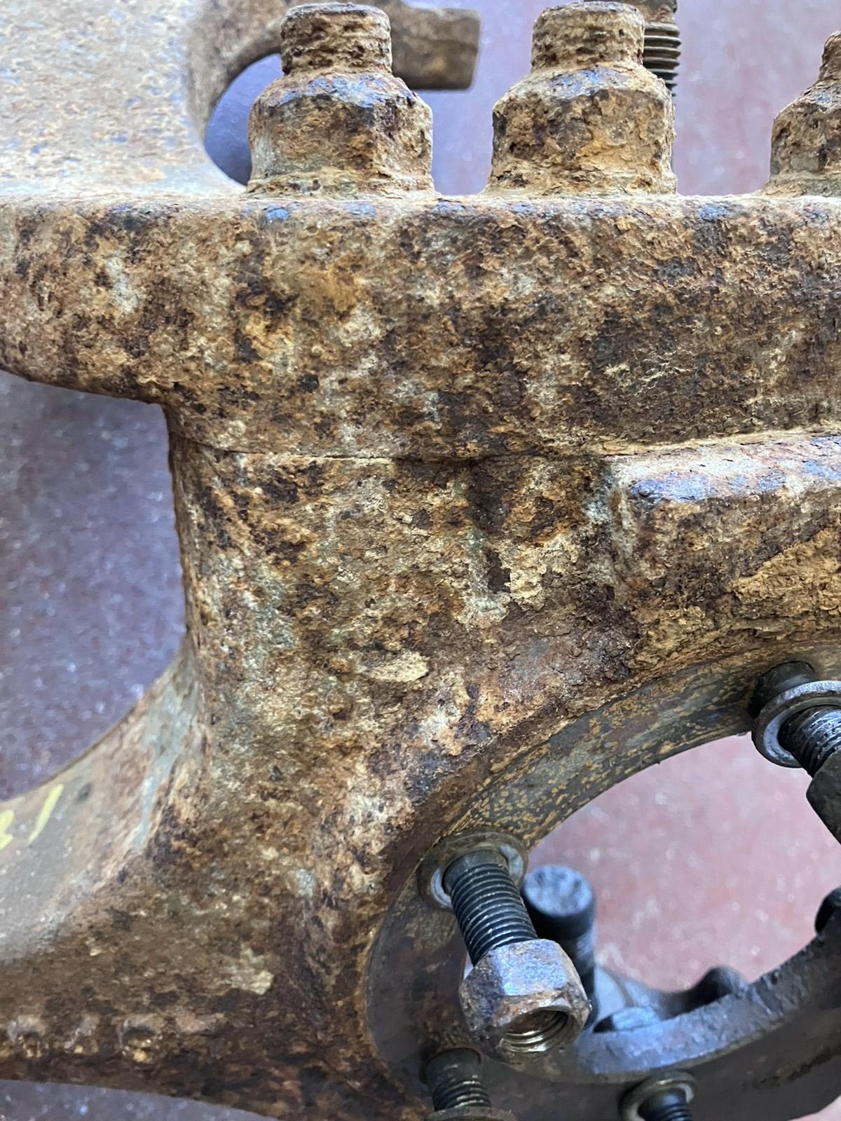 This is a used driver side (left-hand) front 4X4 steering knuckle removed from a 1986 Dodge Ram W150 Pickup. The Mopar part number is 53009841 and the Hollander interchange number is 515-964. It is in usable condition but is rusty.